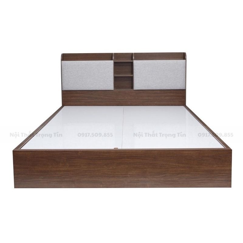 Mẫu giường được thiết kế hiện đại với đầu giường bọc nệm màu sáng, tạo cảm giác thư giãn khi tựa lưng đọc sách hay xem phim. Ngoài ra, phần kệ nhỏ tích hợp ngay đầu giường giúp tiết kiệm diện tích và tăng tính tiện lợi.